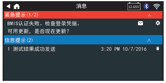 消息 “消息”功能显示即将进行的测试和活动的警报和通知。包括计划测试以软件更新和维护。 点击 返回到上一屏或点击 返回到主菜单。 收到消息 当收到任何关键消息时,消息图标旁边会显示一个数字。这个数字不含非重要通知。 1. 点击主菜单上“消息”。 2. 点击 阅读消息。 执行消息操作事项。 删除消息。 3. 点击 ∧ 可折叠消息列表或 ∨ 展开列表。 消息类型 紧急提示:重要的操作不能执行,可能需要用户操作。 信息提示:表示操作已经完成或数据已经发送。 Updated on January 15, 2024 Related Articles 支持 设置 历史